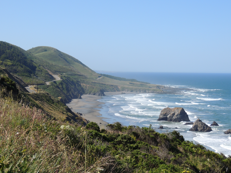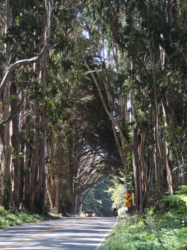 Auch heute zeigte sich bald, dass ein solides ausgiebiges Frühstück eine gute Grundlage ist, um den Anforderungen eines Ozeanküstenradlers gerecht zu werden. Anforderungen heißt in diesem Fall … Serpentinen! Wer glaubt, dass man so schön auf einer geschwungenen Küstenstraße auf einer Höhe dahinsurren kann, der irrt. Auf dem kurzen Stück von Westport nach Fort Bragg ging es immer wieder in steilen Anstiegen bergauf, aber – alte Radler- und Wandererweisheit – wo ein Berg da auch ein Tal. Die Schussfahrten konnte man kaum ausfahren, weil man da selbst als Radler die empfohlene Geschwindigkeit für die eine oder andere Kurve nicht eingehalten hätte. Besonders schön ist so ein Anstieg dann, wenn man mangels Ausweichmöglichkeit von einem Truck den Berg „hinaufgetrieben“ wird (zumindest empfindet man es als Radler so). Dort wo die State Route oder „California 1“ an die Küste heran reicht, sind die Ausblicke natürlich wie immer fantastisch. Aber selbst die „normale“ Strecke hat ihre Reize: riesige Eukalyptusbäume am Straßenrand, sogar wie ein Tunnelgewölbe über der Straße.