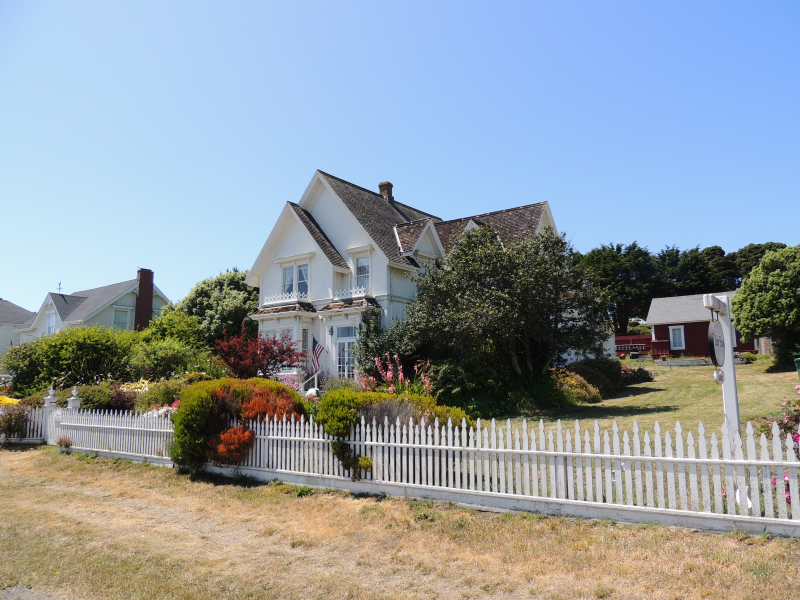 In Fort Bragg erledigten wir im kleinen aber feinen „Stadtpark“ ein paar wichtige Telefonate, da wir erst hier wieder ein Netz hatten. Dann Zwischenstopp bei der Cyclery. Ich ließ gleich noch den Mantel wechseln, der eh schon ein Loch hatte und schon ganz schön abgewetzt war. Im Laden kamen wir mit einem anderen Kunden ins Gespräch an dessen Rad gerade noch gewerkelt wurde. Er war aus San Franciso, und so bekamen wir nebenbei noch wichtige Tipps für günstige Unterkünfte und den Transfer zum Flughafen. Während mein Rad gerichtet wurde, nutzten Birgit und ich die Zeit für die vorgezogene Mittagspause. Natürlich wurde man immer wieder angesprochen wo es hin ging usw. Das Rad war fertig – wie sagte es der Mann im Fahrradladen zu einem anderen Kunden: „Leute wie diese hier (er meinte uns) halten uns über Wasser.“ Noch ein Eintrag im „Gästebuch“ des Fahrradladens und weiter ging’s. Nächstes Ziel war Mendocino, ein nettes, als Künstlerdorf apostrophiertes Örtchen mit etlichen schmucken alten Häuschen. Es gab ein Art Center und eine Theater Company, sogar einen Buchladen. Und natürlich wieder eine schöne Bucht.