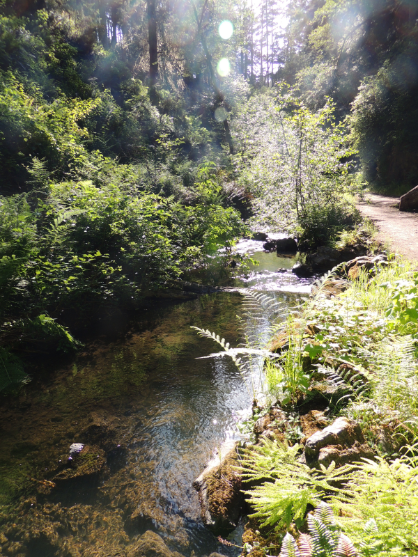 Letzteres trifft auch auf unser Etappenziel zu, kurz vor den Einfahrt in den Van Damme State Park liegt eine ausgedehnte Bucht. Mit dem beginnenden Wochenende ist der Zeltplatz im State Park auch gut besucht, selbst von den schätzungsweise 4 Hiker/Biker-Zeltplätzen sind (uns eingeschlossen) drei belegt. Während Birgit bereits das Zelt aufbaute, radelte ich noch einmal auf den nächsten „Berg“ und kaufte dort noch etwas zum Abendbrot ein, u.a. einen Rotwein aus dem Mendocino County. Da es aber erst nachmittags war, machten wir noch eine kleine „Wanderung“ im State Park und zwar entlang eines kleinen Flusses – der auch so heißt („Little River“) – in der Farnschlucht. Zum Anfang des Wanderweges wurden gleich Tipps für eine etwaige Begegnung mit Berglöwen gegeben. Zum Glück konnten wir ungestört die Landschaft genießen. Nach dem Abendessen verschlossen wir aber unsere Lebensmittel, wie empfohlen, in einer Tasche und in einen der auf dem Zeltplatz aufgestellten Schränke – auch zum Schutz vor frechen Waschbären.