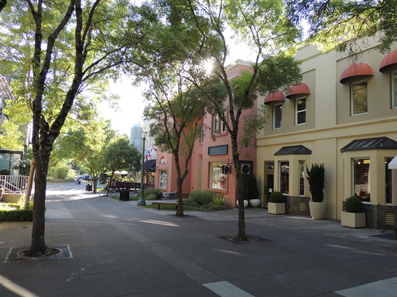 Da uns Healdsburg als absolut sehenswerter Ort schmackhaft gemacht wurde, begaben wir uns natürlich in Richtung Innenstadt. Es gibt eine Plaza umgeben von Palmen, Redwood- und anderen riesigen Bäumen in der Mitte des Ortes, mit Springbrunnen und zahlreichen Bänken. Unser einziger Gedanke in der Hitze war: jetzt ein Eis und sich gemütlich auf einer der Bänke im Schatten ausruhen. Eine offensichtliche Eisdiele gab es nicht, doch nachdem wir eine Runde um den Block spaziert waren, fanden wir einen Süßwarenladen, der auch verschiedene Sorten Eis und Sorbets anbot – die außerordentlich lecker waren. Der Ort insgesamt machte wirklich einen sehr netten, ruhigen Eindruck. Es gab allerlei Weinlokale, Restaurants, Boutiquen etc., also eher etwas für wohlhabendere Zeitgenossen. Wir fanden schließlich eine Brauerei mit angeschlossenem Restaurant, wo wir auf einer schattigen Terrasse unseren Hunger und Durst stillen konnten. Zurück im Hotel planten wir, wie üblich die Route für den nächsten Tag.