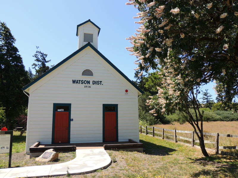 Einen Zwischenstopp machten wir noch. Mitten auf dem Land zwischen Weiden und Hügeln lag die Watson School, eine historische Schule mit einem Klassenzimmer, die auf gespendetem Land und mit tatkräftiger Unterstützung durch die Siedlerpioniere gebaurt wurde. Neben der Schule erinnerte auch eine Tafel an die Aktion von Christo, der 1976 durch Marin County und Sonoma County mit Drahtseilen und Planen einen Zaun bis zur Küste zog. (Siehe auch den gestrigen Blog-Eintrag)