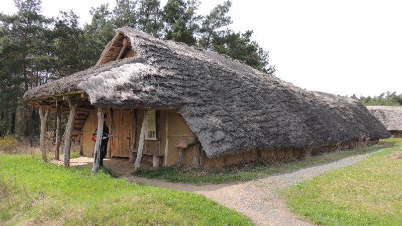 Und dann, noch ein Riesensprung – diesmal in der Zeit: ein Steinzeitdorf bei Randau. Die reetgedeckten Langhäuser waren die ersten Behausungen der sesshaft gewordenen Viehzüchter und Ackerbauern. Im Vergleich zum Nomadenzelt aus Tierhäuten boten diese Behausungen viel Platz für Mensch und Tier – eigene Viehställe gab es damals noch nicht.